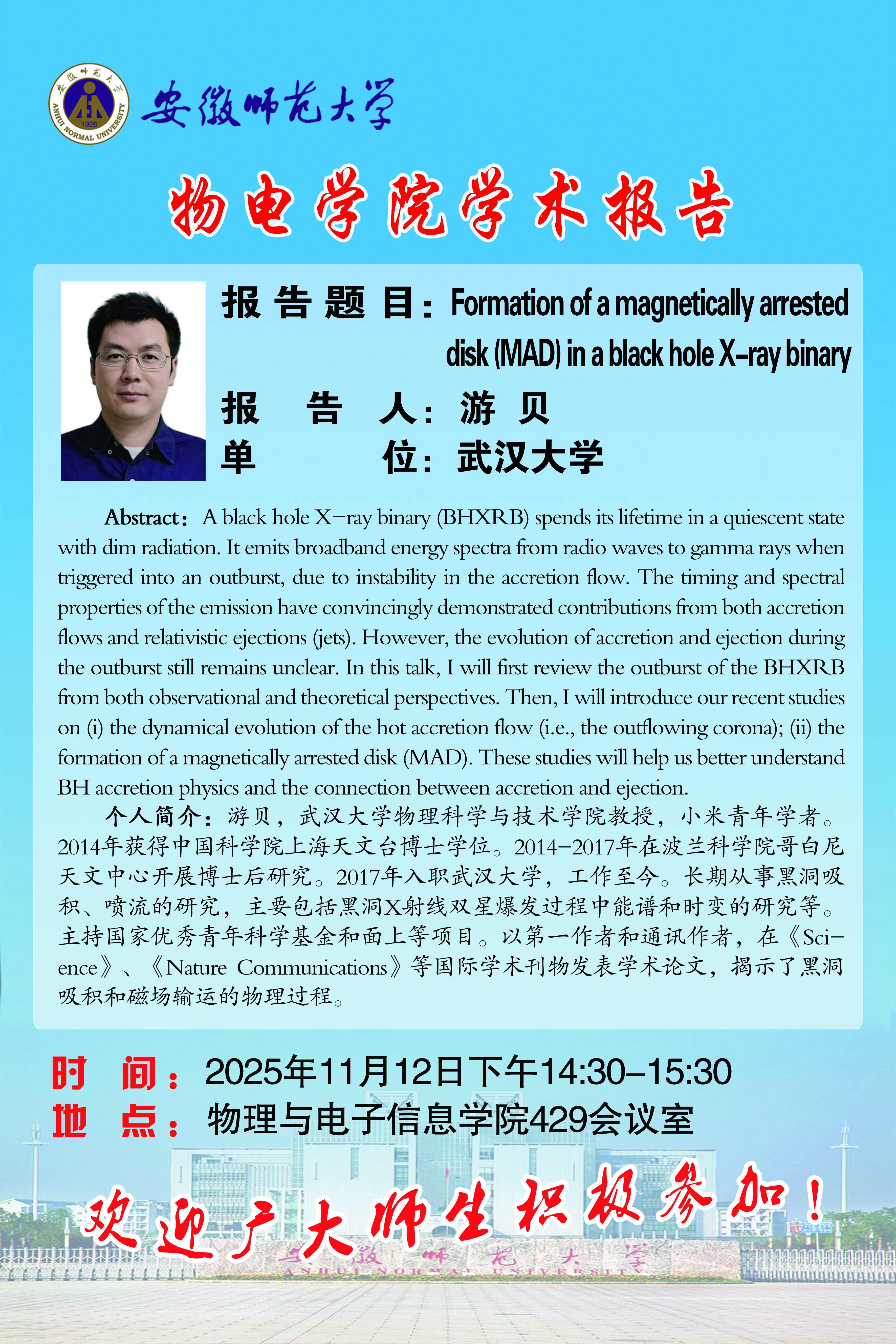 【学术预告】色情网站讲坛2025年第45期:Formation of a magnetically arrested disk (MAD) in a black hole X-ray binary