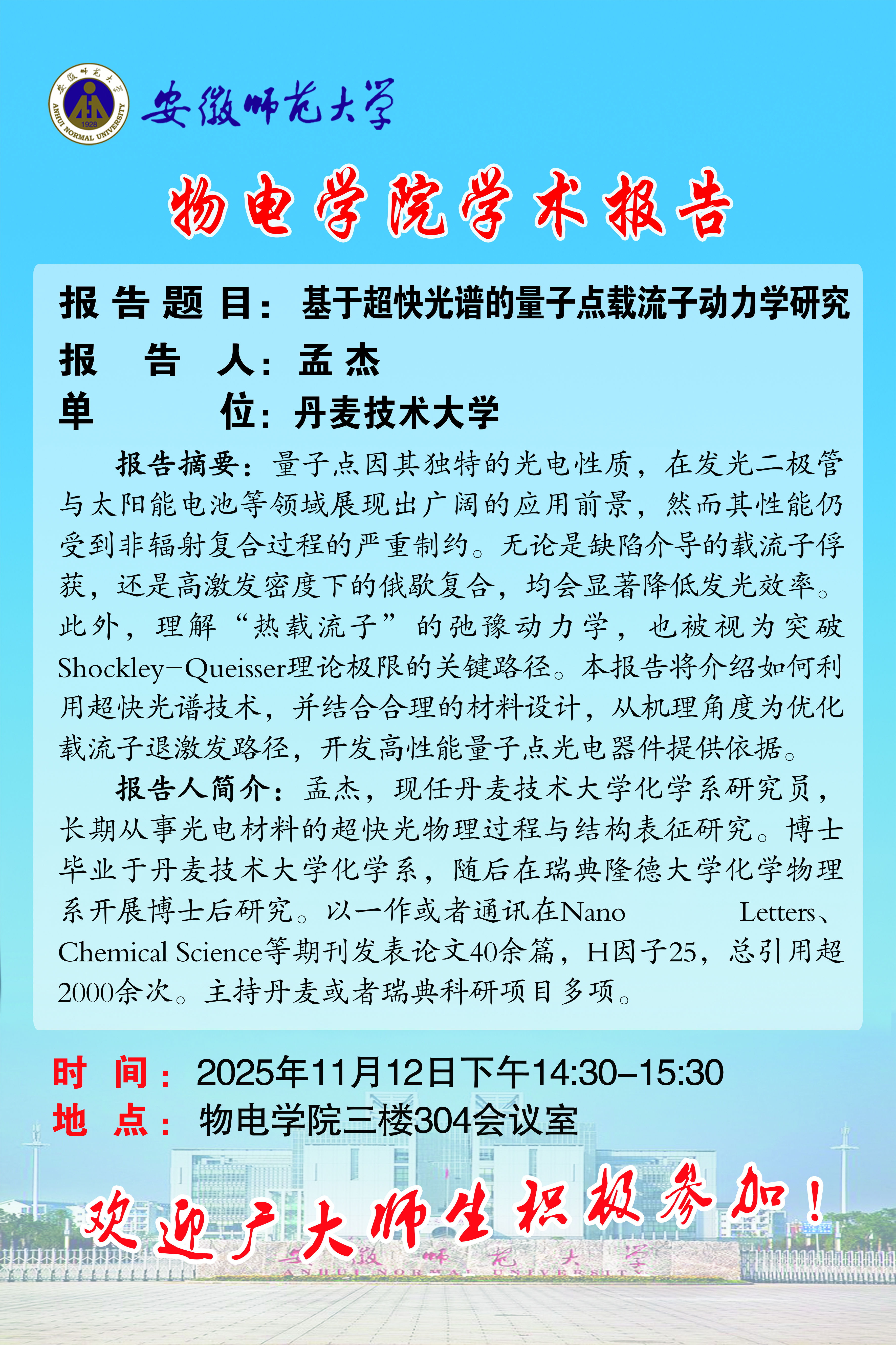【学术预告】色情网站讲坛2025年第47期:基于超快光谱的量子点载流子动力学研究